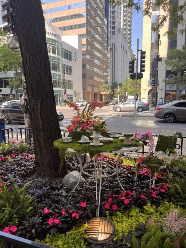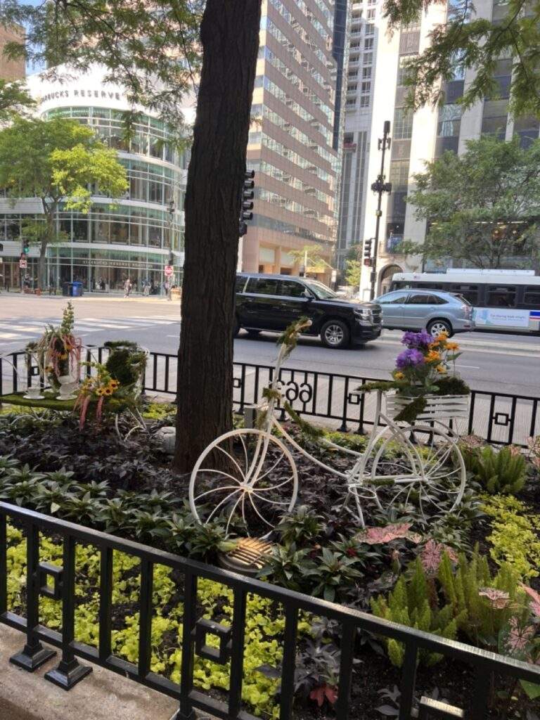 The garden beds are decorated with bikes and other items. Also, The Magnificent Mile is home to the largest Starbucks in the United States.