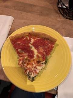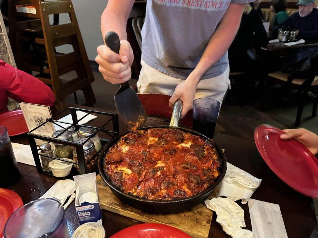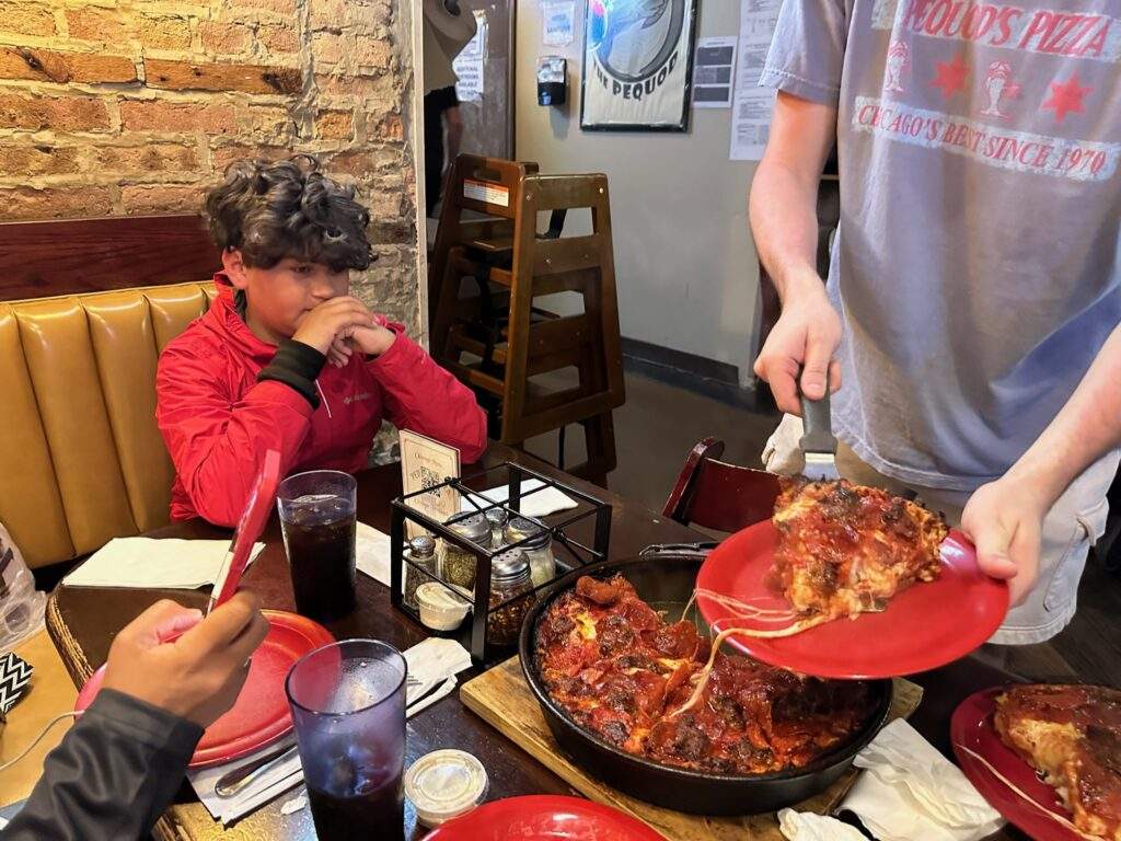 If you’re visiting Chicago with teenagers, this is an absolute must. My family is open to trying new things, so we ordered this pizza. Keep in mind the typical preparation time for this pizza is 45 minutes. We were served tasty cheese bread and beverages while we waited.
