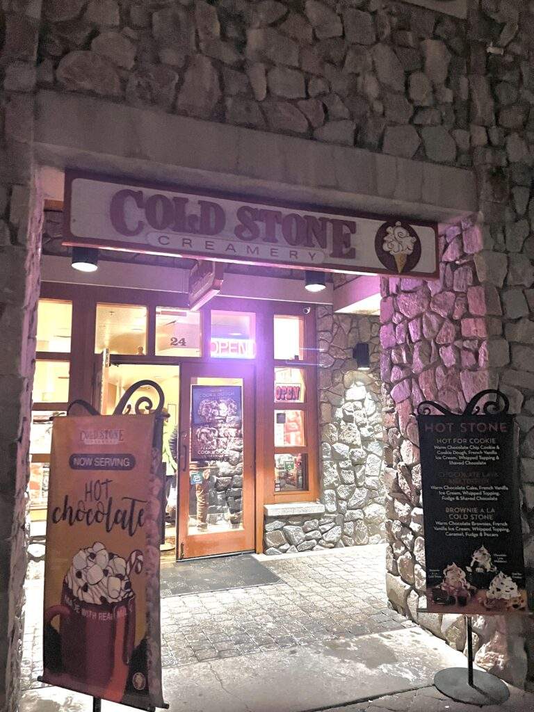 Cold Stone Creamery for dessert: grab dessert here. It is located in Heavenly Village at 1001 Heavenly Village Way Suite 24, South Lake Tahoe, CA 96150.